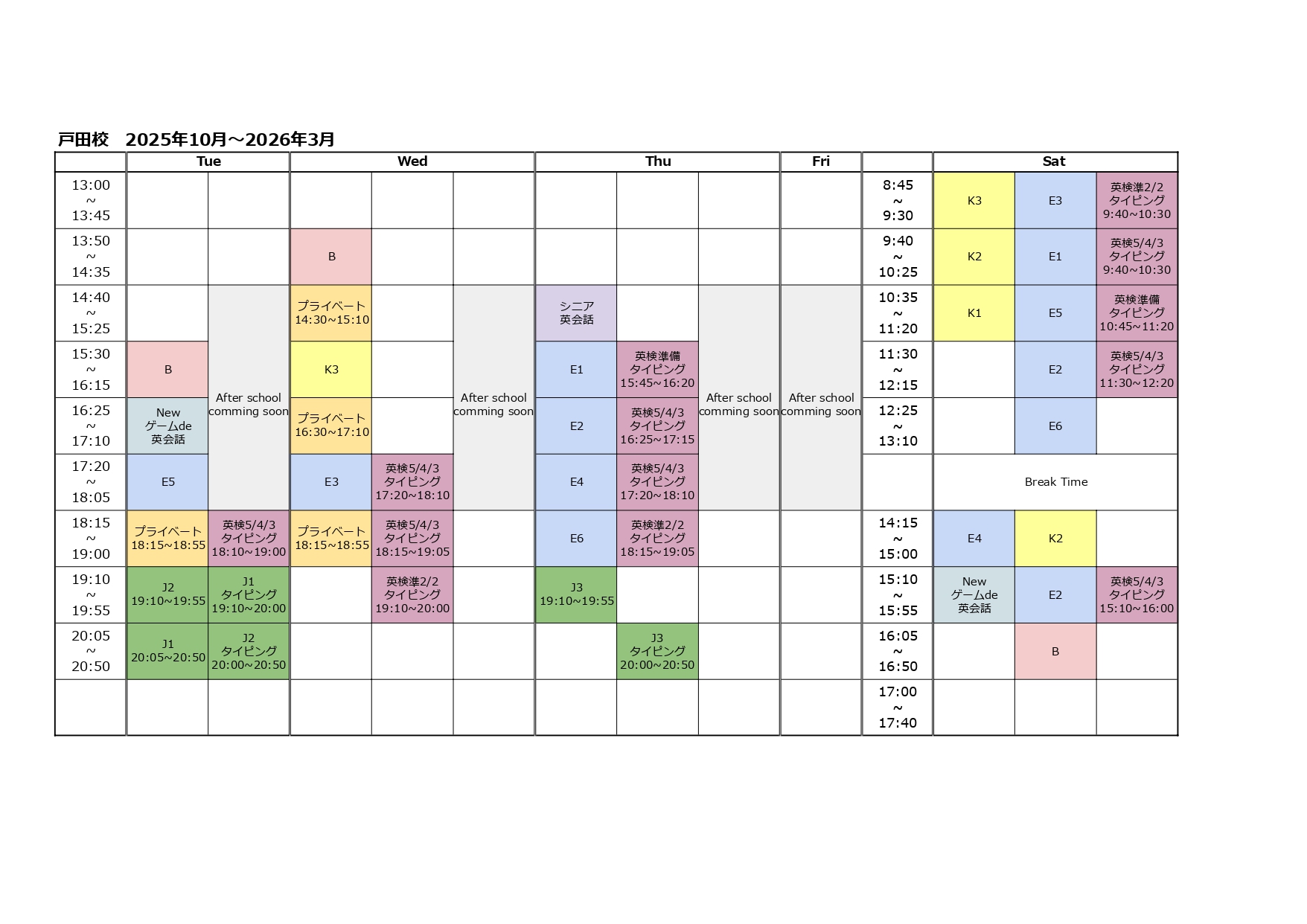 実施中のレッスン ツリーベルには年齢別・能力別に豊富なクラスを用意しております。お子様の年齢・実力に応じたクラスでお子さんの能力を最大限引き出していきます。 耳の発達が早い乳幼児には乳幼児クラス、遊びや楽しさを重点的に英語に慣れる園児クラス、会話を楽しむ小学校低学年クラス、文法も含めて大人との会話の成立、文章表現を目指す小学校高学年クラス、そして実践的な英語レッスンが積める中学校クラス、さらに戸田校は子供だけではなく大人も楽しめる会話強化クラスも設定し、様々なクラスを用意しています。得意不得意に合わせて少人数レッスンだからできる英語教室。身に着く力の違いがきっと実感頂けると思います。